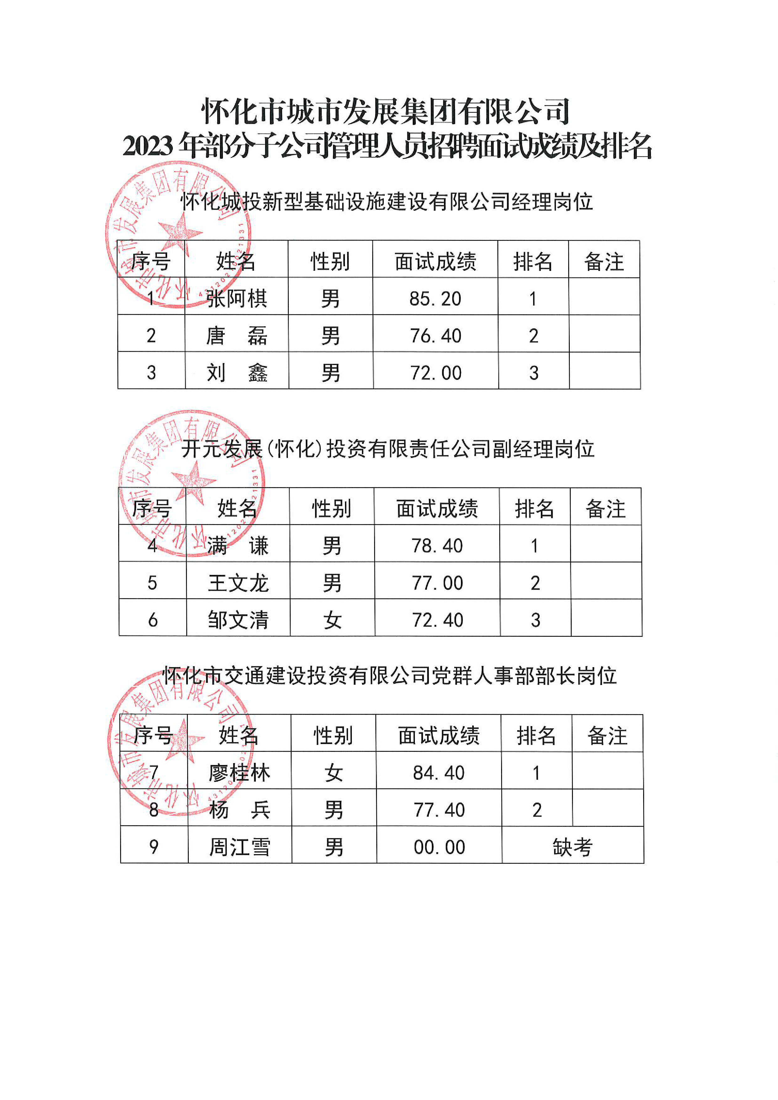 懷化市城市發(fā)展集團(tuán)有限公司2023年部分子公司管理人員招聘面試成績(jī)及排名