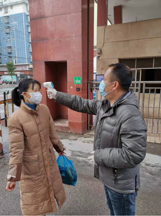 2月4日,突擊隊員為小區(qū)進出人員檢查體溫