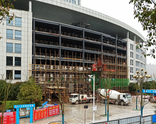 走進市民服務(wù)中心D棟施工現(xiàn)場,只見泵車正在澆筑六樓混凝土,3臺攪拌車有序作業(yè)、升降機上下忙碌,工人們戴著口罩卯足干勁,工地上呈現(xiàn)一派熱火朝天的景象?!盀榱粟s進度,我們從其他項目臨時借調(diào)人員過來。” 項目負責(zé)人向躍蘭告訴記者,現(xiàn)在工地上有40多名工人,他們在抓緊施工的同時,關(guān)閉員工食堂,向政府食堂報餐,實行“盒飯打包、分散就餐”,確保施工、防疫“兩不誤”。