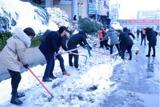 工作人員們發(fā)揚不怕苦、不怕累、不畏嚴寒的精神,分工合作,鏟的鏟,掃的掃,干得熱火朝天,很快厚厚的積雪就被大家清理干凈了。大家在除雪的同時,還不斷提醒路人“小心地滑,注意安全”。