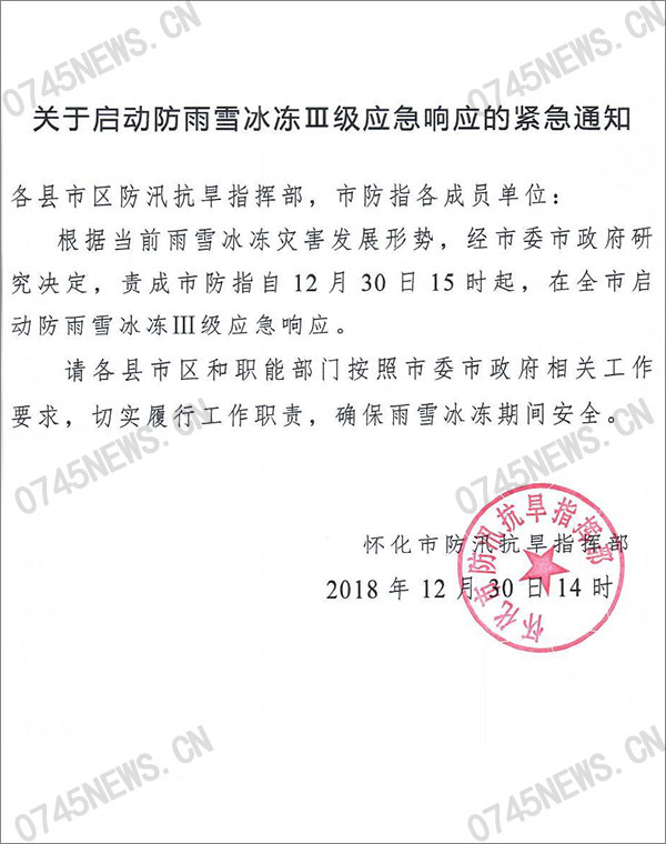 懷化市啟動(dòng)防雨雪冰凍Ⅲ級(jí)應(yīng)急響應(yīng)