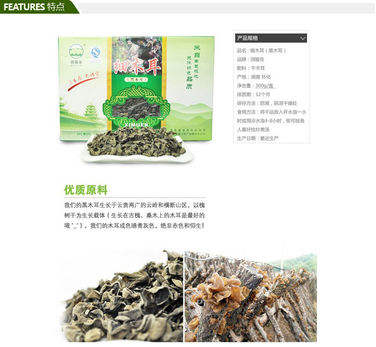 品牌:潤(rùn)福佳 包裝方式: 袋裝 凈重:300g 保質(zhì)期:365天 生產(chǎn)許可證:QS431216010545 產(chǎn)品標(biāo)準(zhǔn)號(hào):GB/T6192-2008 配料表:細(xì)木耳 食品添加劑: 無(wú) 儲(chǔ)藏方法: 防潮、陰涼干燥處 產(chǎn)地: 湖南省 懷化市通道 |