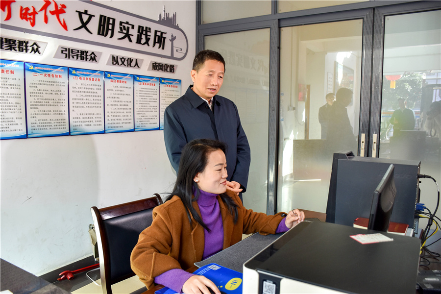(許忠建在洪江市深渡苗族鄉(xiāng)政府,詳細了解鄉(xiāng)村振興、安全生產、值班值守、基層減負等情況。懷化日報全媒體記者 黃莎 攝)