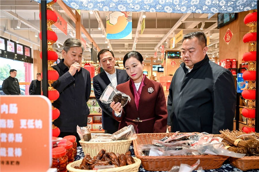 (1月9日下午,市委副書(shū)記、市長(zhǎng)韋朝暉在市文旅體育集團(tuán)、市農(nóng)林集團(tuán)調(diào)研。圖為韋朝暉在市農(nóng)林集團(tuán)“懷鄉(xiāng)懷品”總店詳細(xì)了解市場(chǎng)拓展等情況。懷化日?qǐng)?bào)全媒體記者 吳濤 攝)