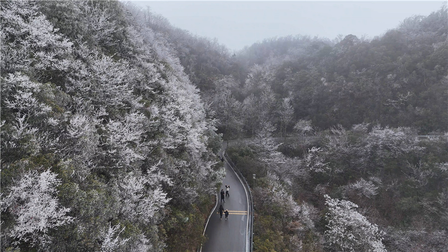此次降雪后,索道沿線山林盡染素白,霧凇晶瑩,云海翻涌,游客乘索道凌空而行,30分鐘內(nèi)便可俯瞰層巒疊嶂間冰裹樹梢、雪覆梯田的奇景。尤其在清晨陽光映照下,冰晶折射出璀璨光芒,仿若步入琉璃世界。