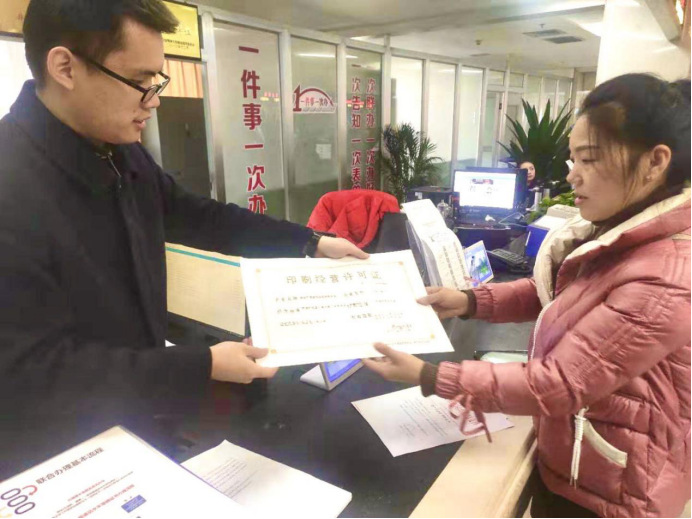 圖為“一件事一次辦”綜合窗口工作人員辦結(jié)柴女士申請辦理的我要開印刷企業(yè)(不含出版物類)事項(xiàng)后為其發(fā)放相關(guān)證件。
