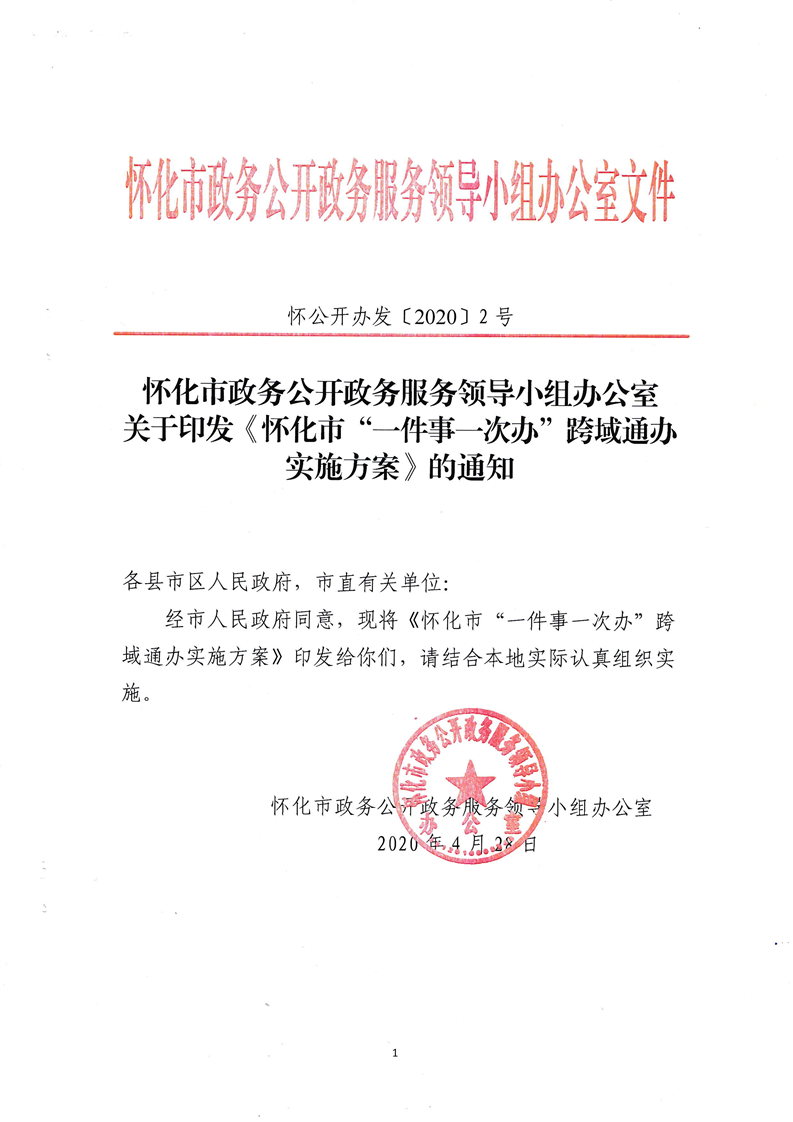 懷化市政務(wù)公開政務(wù)服務(wù)領(lǐng)導(dǎo)小組辦公室關(guān)于印發(fā)《懷化市“一件事一次辦”跨域通辦實(shí)施方案》的通知
