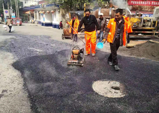 養(yǎng)護(hù)人員正在進(jìn)行路面坑槽修補(bǔ)