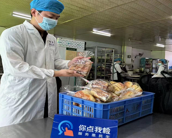 ▲工作人員進(jìn)面包店抽樣