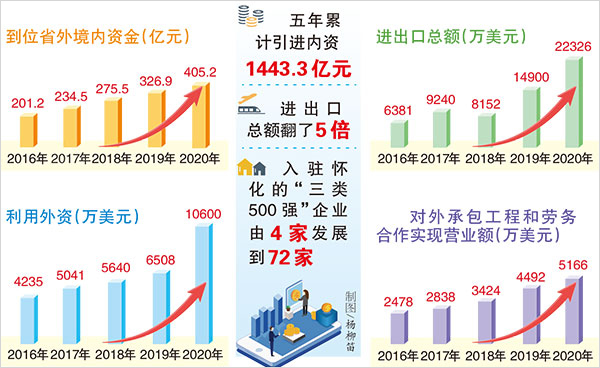 五年累計(jì)引進(jìn)內(nèi)資1443.3億元,進(jìn)出口總額翻了5倍,入駐懷化的“三類(lèi)500強(qiáng)”企業(yè)由4家發(fā)展到72家——
