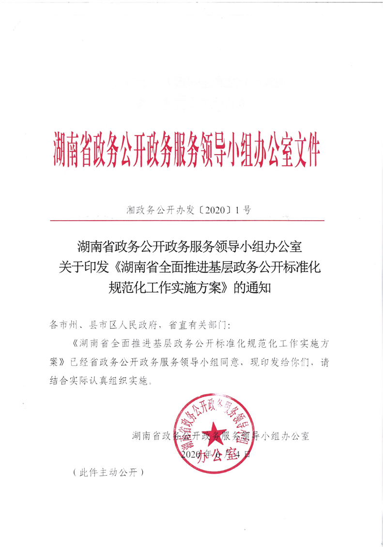 湖南省政務(wù)公開政務(wù)服務(wù)領(lǐng)導小組辦公室關(guān)于印發(fā)《湖南省全面推進基層政務(wù)公開標準化規(guī)范化工作實施方案》的通知(湘政務(wù)公開辦發(fā)〔2020〕1號)