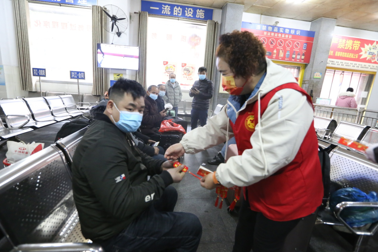 志愿者為春運首天首批幸運旅客送上專屬福袋和祝福。隨后,志愿者一起為候車大廳掛燈籠、貼福字,為旅客營造濃厚的節(jié)日氛圍,并圍繞重點旅客開展搬運行李、票務協(xié)助等志愿服務,做好疫情防控、安全生產等宣傳。(洪江區(qū)春運辦)