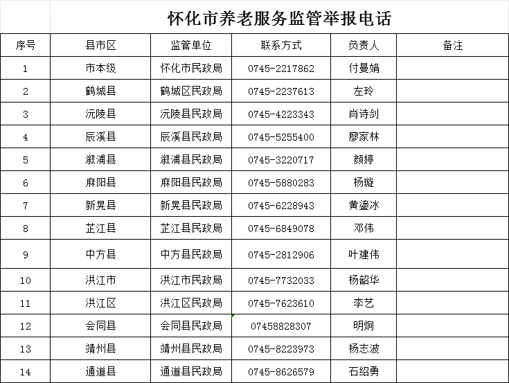 為響應(yīng)社會為老服務(wù)需求,提升養(yǎng)老服務(wù)質(zhì)量,加強對養(yǎng)老機構(gòu)和養(yǎng)老從業(yè)人員的監(jiān)督,回應(yīng)民眾關(guān)切,推動養(yǎng)老事業(yè)和養(yǎng)老產(chǎn)業(yè)協(xié)同健康發(fā)展,經(jīng)市縣民政部門確認,現(xiàn)將懷化市縣兩級養(yǎng)老服務(wù)熱線和監(jiān)管舉報電話,在懷化轄區(qū)內(nèi)依法辦理法人登記并在民政部門備案且通過消防審驗的養(yǎng)老機構(gòu)名單予以公布并接受社會各界的監(jiān)督。