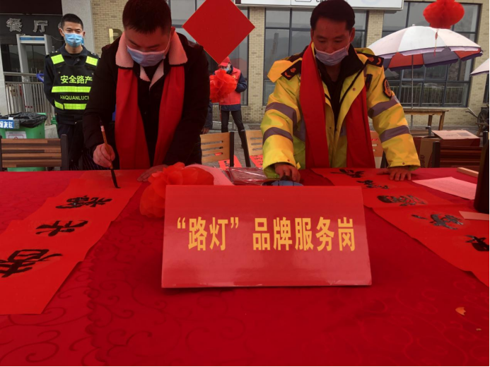 冬日暖陽,春節(jié)腳步臨近。1月11日,在G65包茂高速公路洪江服務(wù)區(qū)內(nèi),繁忙而有序。在服務(wù)區(qū)一側(cè),懷化分公司的“路燈”志愿者正在現(xiàn)場揮毫潑墨、寫福送春聯(lián),洋溢著濃濃的喜慶氛圍。活動現(xiàn)場引來許多司乘朋友圍觀,有的直接挑選已經(jīng)寫好的“成品”,有的則根據(jù)自己的需要邀請志愿者為他們“量身定制”。一幅幅紅春聯(lián)和金燦燦的“?!弊譂M載著新春祝福,傳遞著濃濃溫情。