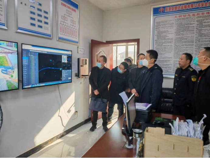副縣長舒斌(右三)在順達危貨公司通過監(jiān)控平臺抽查危貨車輛安全運營情況