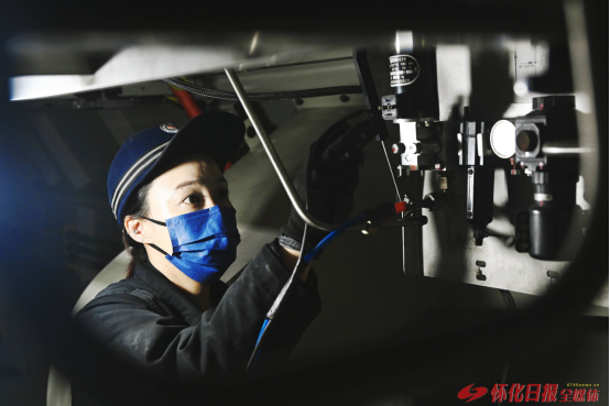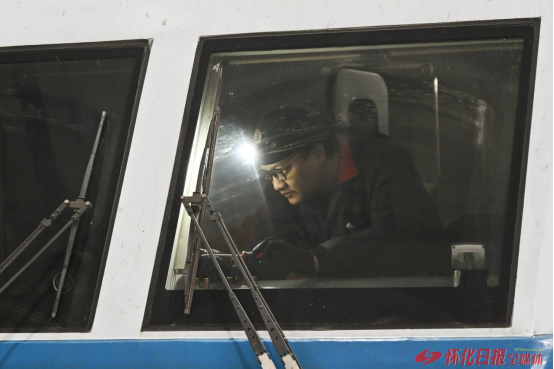 (1月13日,在懷化機務(wù)段檢修庫內(nèi),工作人員正在檢查HXD1型電力機車司機室部件。)