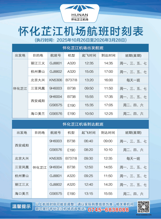 此外,提醒各位旅客,航班信息可能會(huì)變化,請(qǐng)以實(shí)際購票信息為準(zhǔn),如遇到相關(guān)乘機(jī)問題,歡迎撥打懷化芷江機(jī)場(chǎng)咨詢電話:0745-6838088。