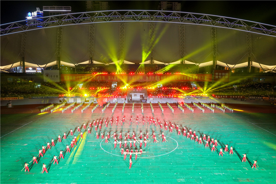 (10月28日晚,懷化市第七屆運(yùn)動(dòng)會(huì)在市體育中心開幕。來自13個(gè)縣(市、區(qū))的健兒參賽,涵蓋老中青群體,他們將在多個(gè)項(xiàng)目中展開角逐 。圖為開幕式文藝演出現(xiàn)場(chǎng)。懷化日?qǐng)?bào)全媒體記者 潘雨 攝)